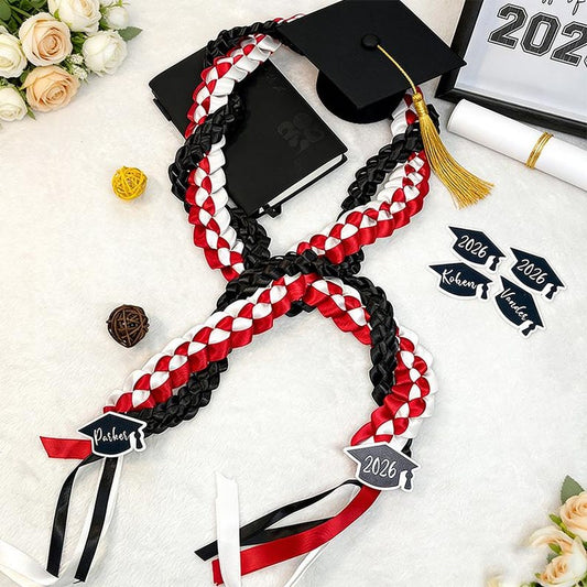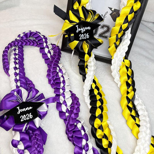 Personalized Tri-Color Graduation Lei, Acrylic Name & Year Ends, Custom 3 Ribbon Colors
