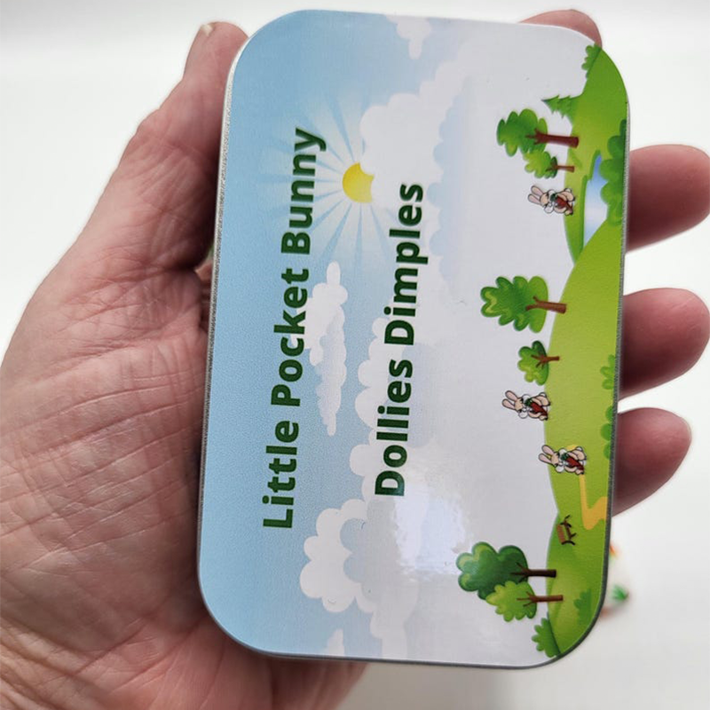 The blue ear baby bunny comes in a blue vinyl decal pocket tin and pink ear baby bunny comes in pink vinyl decal pocket tin. The pocket tin is approx 9cm