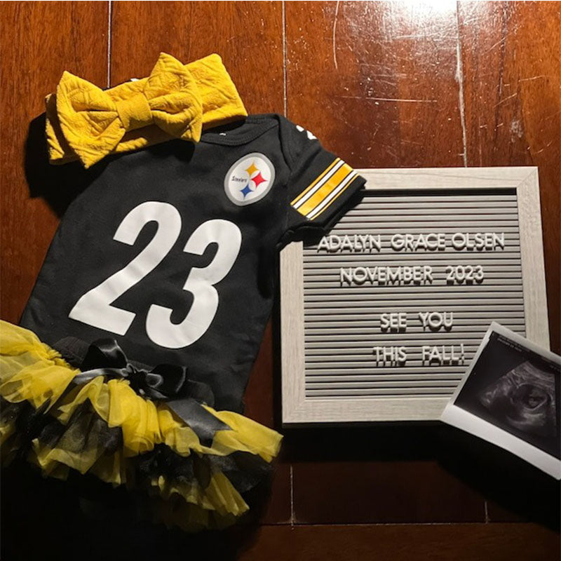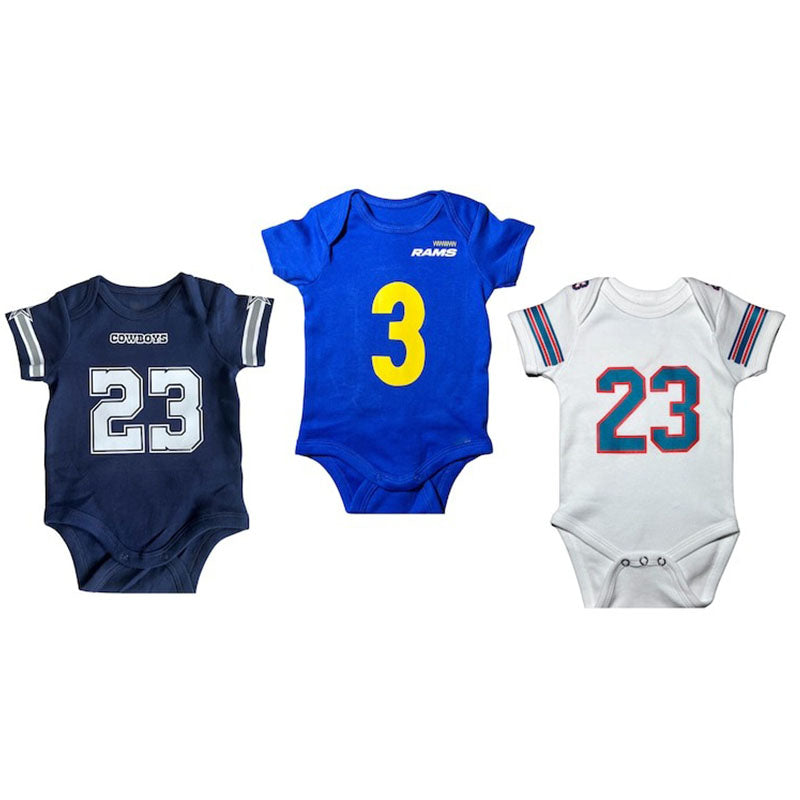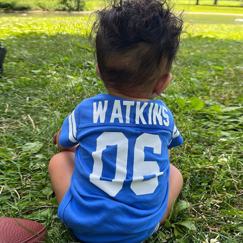 The Custom Baby Football Jersey Bodysuit is here! Get your favorite Tiny Fan ready for game day with our handmade, made-to-order, 100% cotton bodysuits that are as personalized as they are adorable! You choose the team, name, and number, making it a totally unique present. This one-of-a-kind infant bodysuit, a replica of the real jersey, can be made for any team at any level. Recreate or replicate the jerseys of your favorite athletes, or design your own. Our custom created products are great for kids who like to showcase their team spirit on game day or simply displaying their personality.